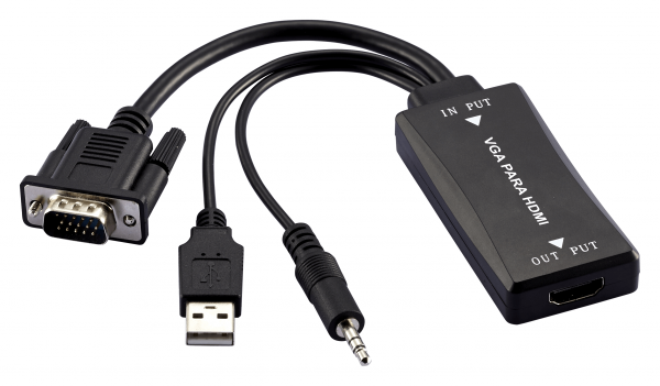 VGA macho x HDMI fêmea + cabo áudio P2 macho + cabo carregador USB